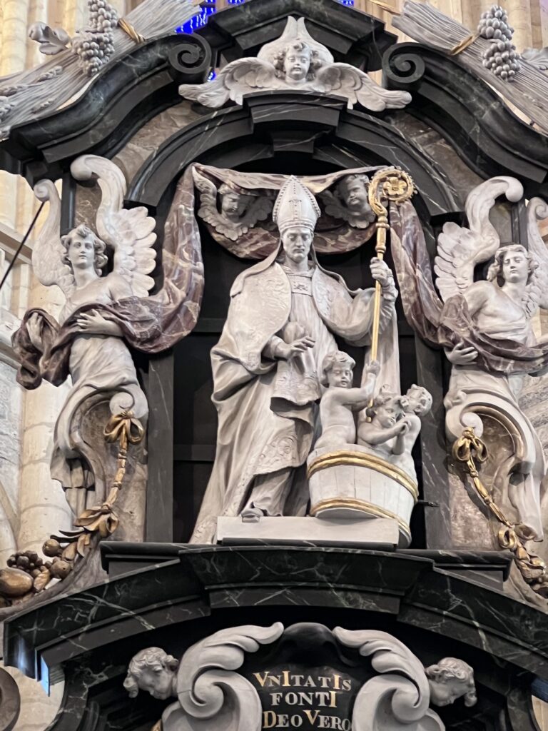 Het hoofdaltaar is van Mattheus van Beveren (±1630-1690) en is gemaakt in de jaren 1677-1678. In een nis, helemaal bovenaan het retabel van het hoogaltaar, is een witte sculptuur van Sint-Nicolaas te zien als bisschop met aan de voeten een pekelvat met drie kinderen. Nicolaas heeft een mijter op, is baardloos, zegent de kinderen met de rechterhand en heeft in de linkerhand een gouden staf vast. Onder de afbeelding van de heilige Nicolaas staat een Latijnse tekst en in het Nederlands geeft dit: “De bron van eenheid is God, de ware Maagd Maria en Sint-Nicolaas”.
