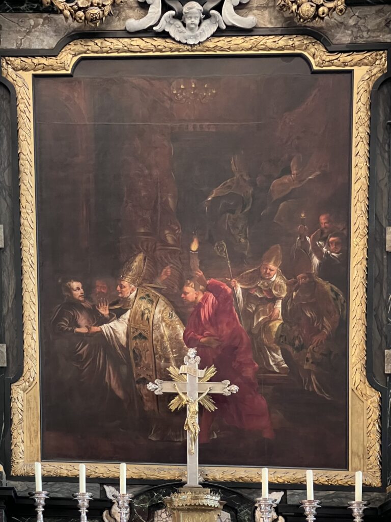 Het schilderij van het hoofdaltaar toont de Heilige Nicolaas, zonder baard. In de linker benedenhoek van het schilderij schrikt Nicolaas bij het betreden van de kerk. Hij deinst achteruit als de bisschop, met gouden kazuifel en mijter, hem bij de hand pakt. Vervolgens wordt Nicolaas aangesteld als bisschop van Myra. Het schilderij is van Nicolas de Liemacker (1575-1646) die het in de periode 1630-1632 heeft gemaakt. Het is een groot kunstwerk en meet 5 bij 3,6 meter. Vermoedelijk is het kunstwerk vlak na 1678 vergroot en passend gemaakt voor het nieuwe hoofdaltaar.