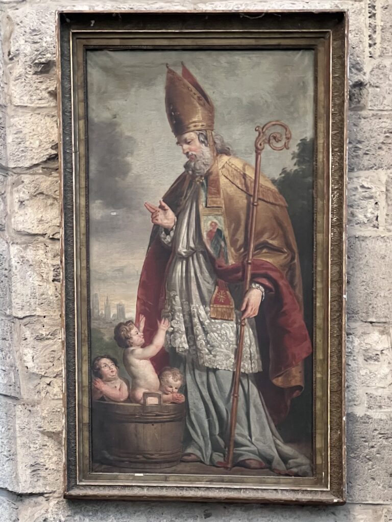 Een beeltenis van de heilige Nicolaas staat Inn een nis Inn de buitengevel van de kerk. Drie kinderen zijn in de ton, Nicolaas kijkt naar hen en zegent de kinderen.