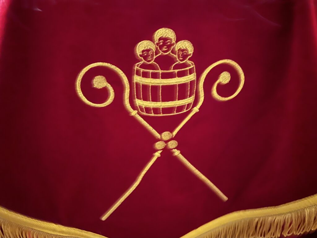 De hoofdbedekking van Sinterklaas is een mijter en deze heeft dezelfde kleur als de mantel. Op de mijter van de Sint behoort een kruis te staan, want hij is een katholieke bisschop. Op een mijter staat ook wel een verticale streep, veelal van goud, of tweemaal de letter “S” van Sinterklaas.