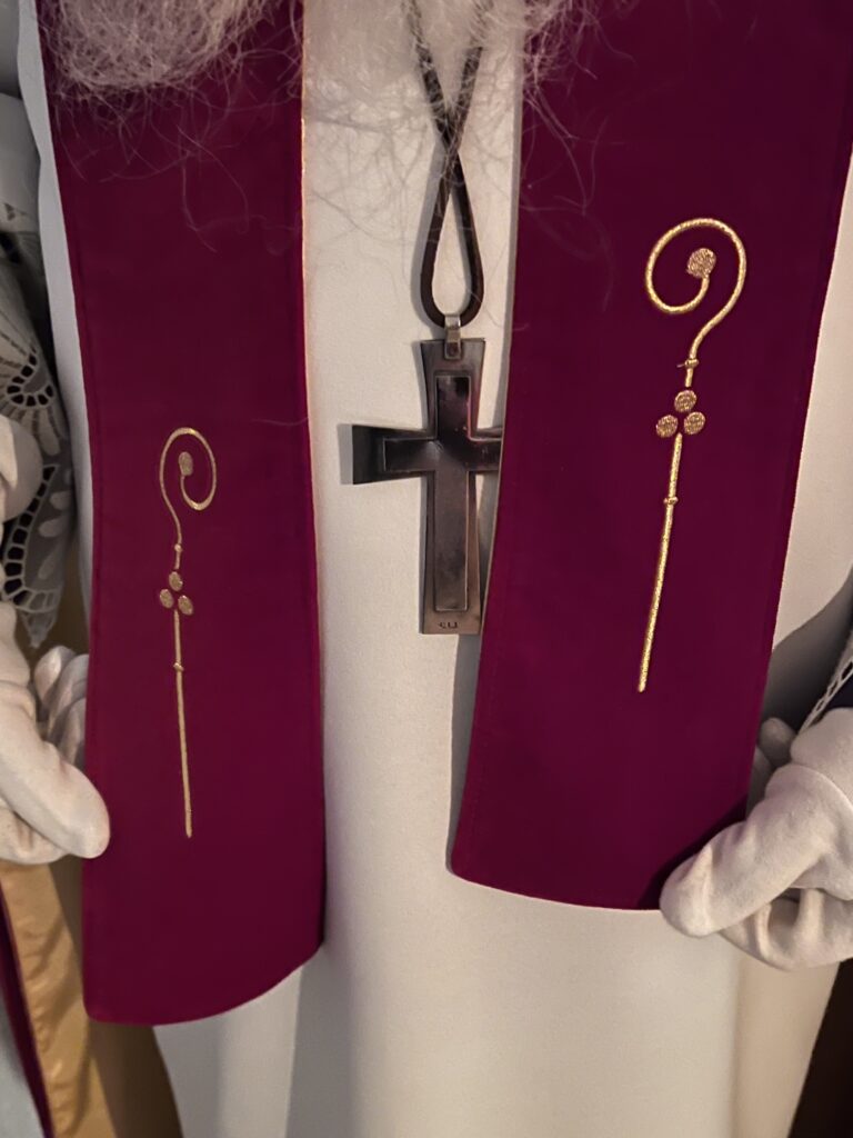 Om de nek draagt Sinterklaas een stola. Dit is een lange, smalle strook stof, waarop aan elke zijde een kruis hoort te staan. Het komt voor dat de stola een of enkele afbeeldingen toont van een of meer legenden of een staf. De stola hangt naar beneden tot kniehoogte en de kleur is dezelfde als mantel en mijter. De stola geeft de waardigheid weer van een bisschop en staat symbool voor verantwoordelijkheid. Voordat Sinterklaas de stola omdoet, kust hij dit kledingstuk in het midden.