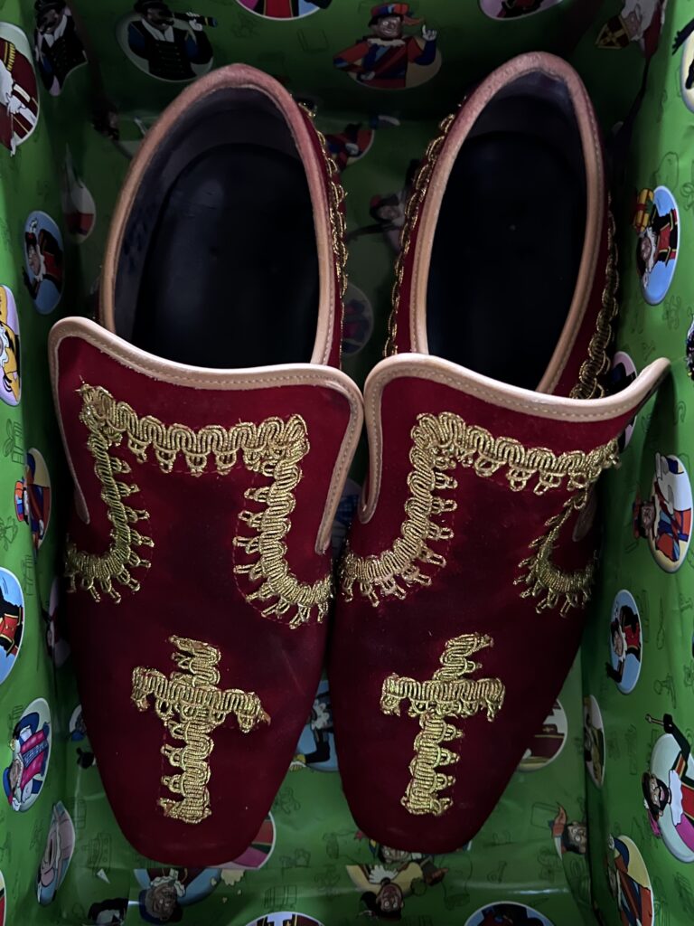Als Sinterklaas er heel verzorgd wil uitzien, draagt hij passende schoenen. Echte Sinterklaasschoenen hebben dezelfde kleur als mantel, mijter en stola en zijn van fluweel of leer gemaakt. Op de wreef van elke schoen staat een gouden kruis en de schoenen zijn vaak versierd met gouden biesjes.