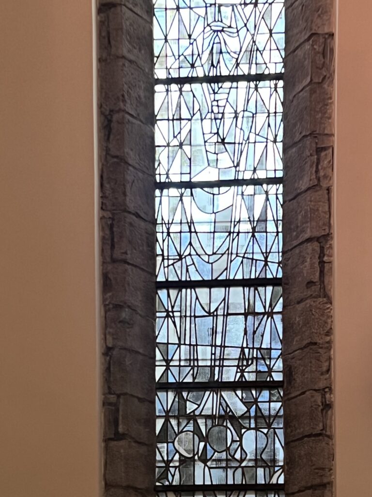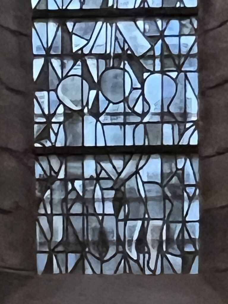 het onderste deel van het glasraam met de drie kinderen in de Onze-Lieve-Vrouwekerk te Kortrijk